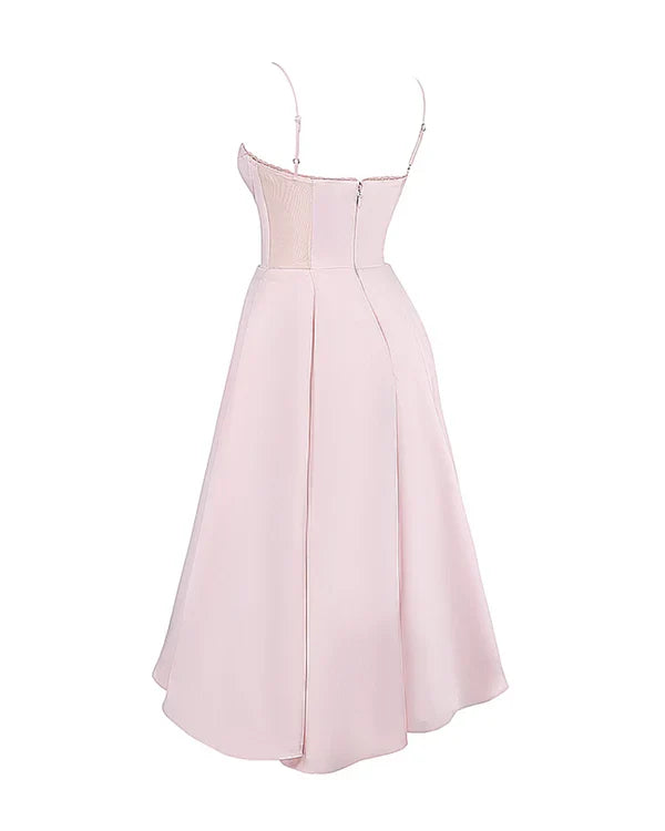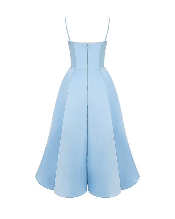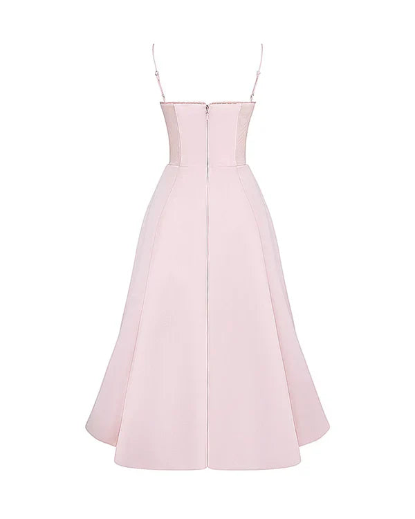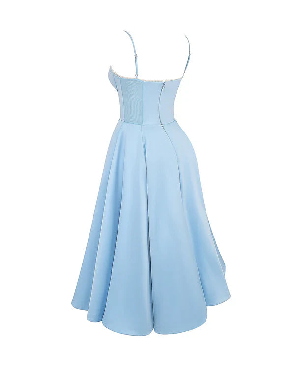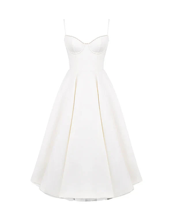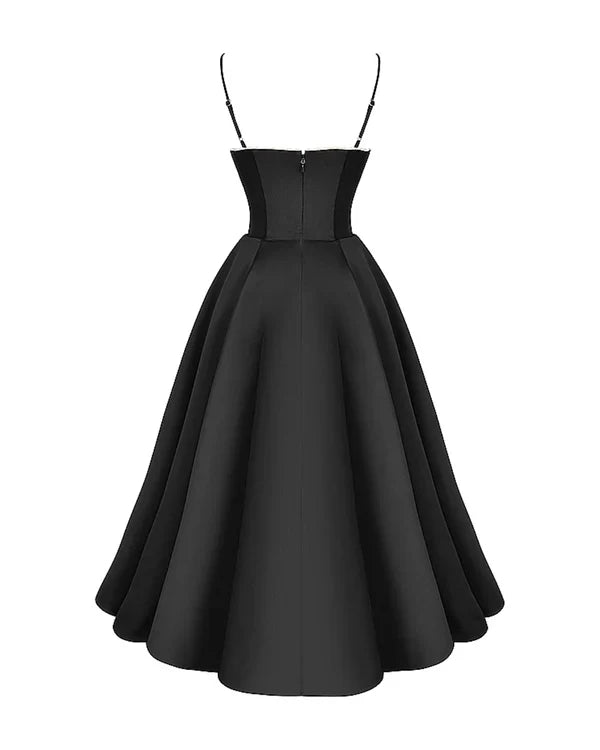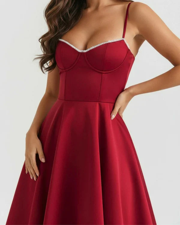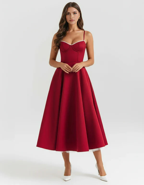 Nuestro vestido midi “Selene” combina elegancia y encanto con su tejido satinado brillante y suave malla elástica. El corpiño con ballenas realza la cintura y el escote corazón con copas aporta soporte y feminidad. Los tirantes ajustables garantizan un ajuste perfecto, mientras que la falda midi con tul añade volumen y un toque de glamour sofisticado.