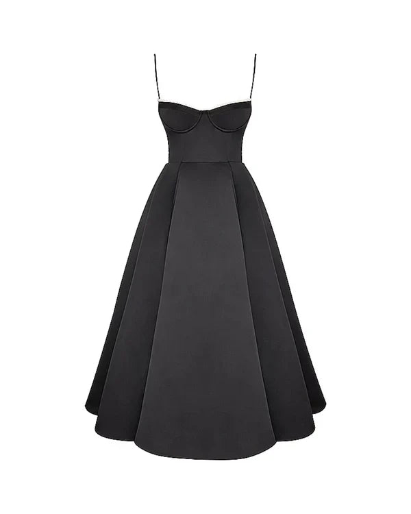 Nuestro vestido midi “Selene” combina elegancia y encanto con su tejido satinado brillante y suave malla elástica. El corpiño con ballenas realza la cintura y el escote corazón con copas aporta soporte y feminidad. Los tirantes ajustables garantizan un ajuste perfecto, mientras que la falda midi con tul añade volumen y un toque de glamour sofisticado.