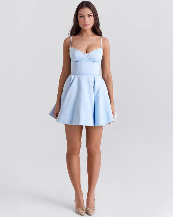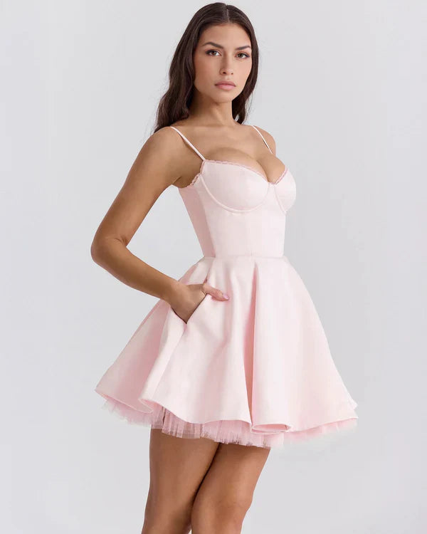 Esta versión mini de nuestro vestido “Selene” es un sueño hecho realidad. Su corpiño con ballenas define la cintura y luce un delicado escote corazón con copas con aros. Los tirantes ajustables garantizan un ajuste perfecto, mientras que la falda corta con capas de tul suave aporta volumen y movimiento. Además, cuenta con bolsillos y forro interior para mayor comodidad, junto con un cierre trasero con cremallera.